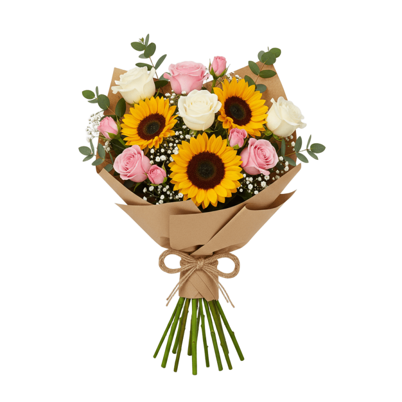 Bouquet composition with a strong presence of sunflowerσ and white and red color roses.