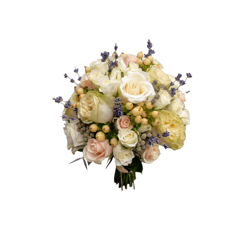 Bridal Bouquet white roses, ivory roses, lavender, hypericum, white buttons.
