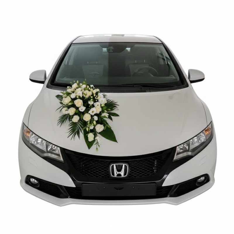 An elegant car basket in white color. The price also includes bouquets with ribbons on the handles.