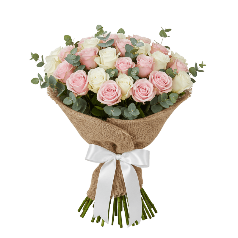 Bouquet of fresh pink and white-ivory roses of the day, tied with eucalyptus and wrapped in a net of suitable color.