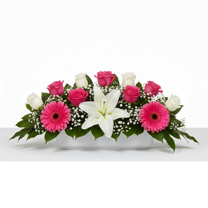 Composition for a table with white and fuchsia roses, white lilies, lycianth, gerbera, eucalyptus, aspetist,