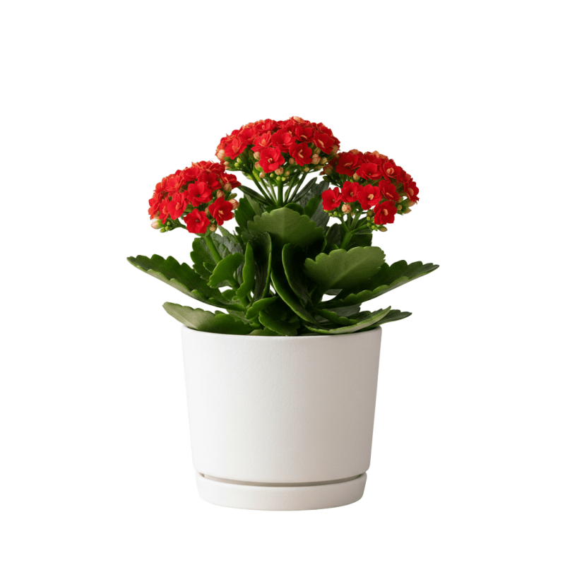 Kalanchoe is a flowering plant that exists in many colors and in all seasons. I have a white plastic pot. Ask us about colors.